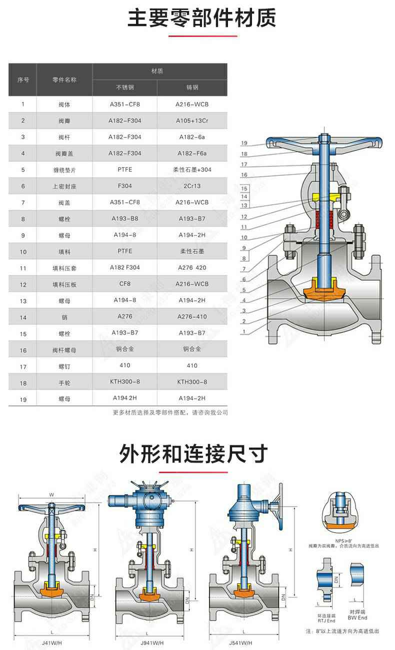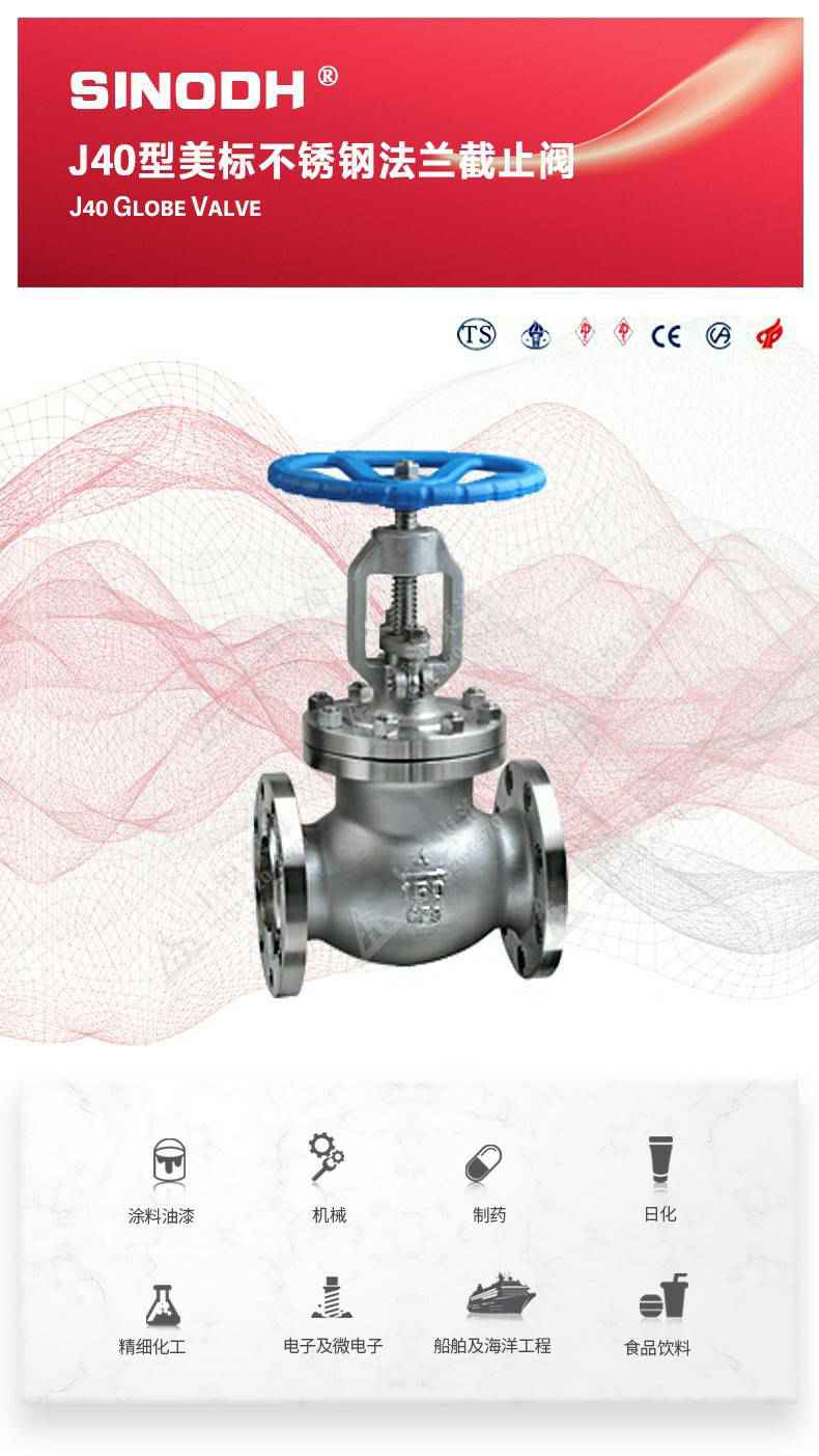 J40型美标不锈钢截止阀,为长春俊鹏精密仪器制造有限公司自主研发生产。本产品的设计制造符合美国国家标准ANSIB16.34,美国石油学会标准AP1 6D和AP I 600要求,产品结构紧凑密、刚性好、封性性能优秀是一种最常见的启闭阀,利用闸板的上下工作来接通(全开)和截断(全关)管道中的流体介质。