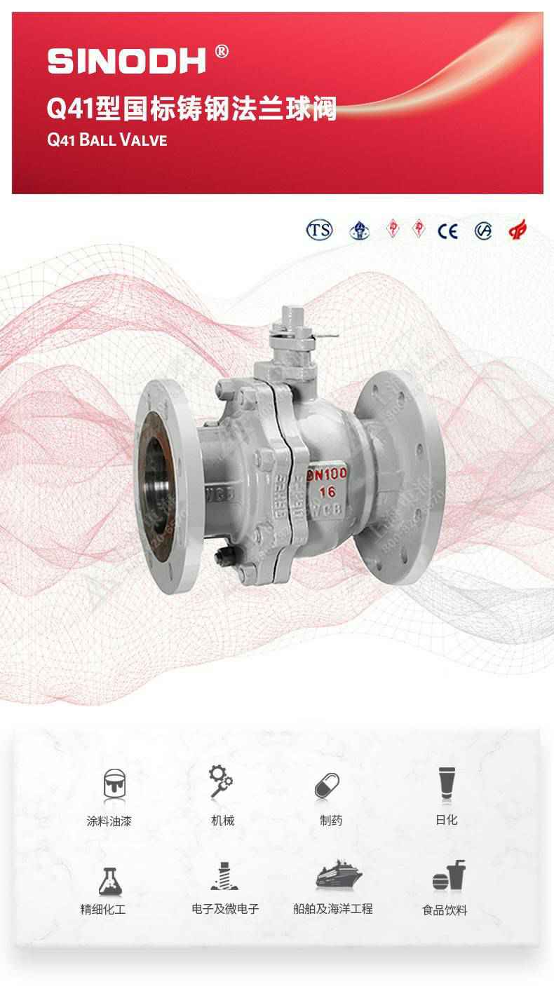 Q41型国标铸钢法兰球阀,为长春俊鹏精密仪器制造有限公司自主研发生产。本产品设计制造标准符合GB/T12237、GB/T12224标准。该产品的球体在介质压力作用下球体能产生一定的位移并紧压在出口端的密封面上,保证出口端密封。适用于水、溶剂、酸和天然气等一般工业介质也适用于工况恶劣的介质,如氧气、过氧化氢、甲烷和乙烯等介质。